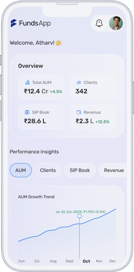 Track business performance in real-time—from client onboarding to AUM growth, SIP book, and revenue reports. FundsApp gives you the tools to scale your advisory with confidence.